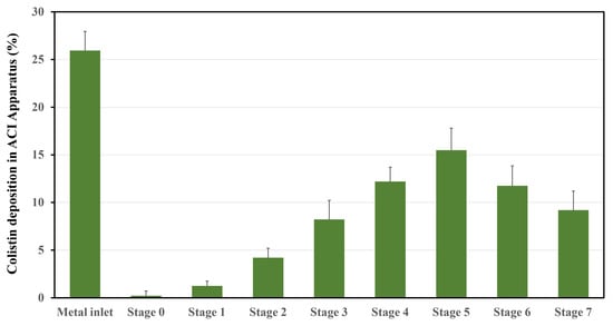 Colistin deposition (%) in each stage of the Andersen Cascade Impactor (ACI, USP apparatus 1) determined at an airflow rate of 28.3 L/min. Results are presented as mean ± SD, n = 6. Cut-off diameters are as follows: Stage 0 (9.0 μm), Stage 1 (5.8 μm), Stage 2 (4.7 μm), Stage 3 (3.3 μm), Stage 4 (2.1 μm), Stage 5 (1.1 μm), Stage 6 (0.7 μm), and Stage 7 (0.4 μm).