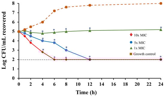 A time-kill kinetics curve of Col-CS-AuNP product concentrate of MDI formulation against E. coli at concentrations of 1×, 5×, and 10× MIC values. The samples were incubated with the tested bacteria at specified intervals (n = 3). The asterisk (*) indicates significant differences (p-value < 0.05) compared to treated and non-treated samples at the same intervals. The dashed line represents a limit of detection of 2 log CFU/mL.