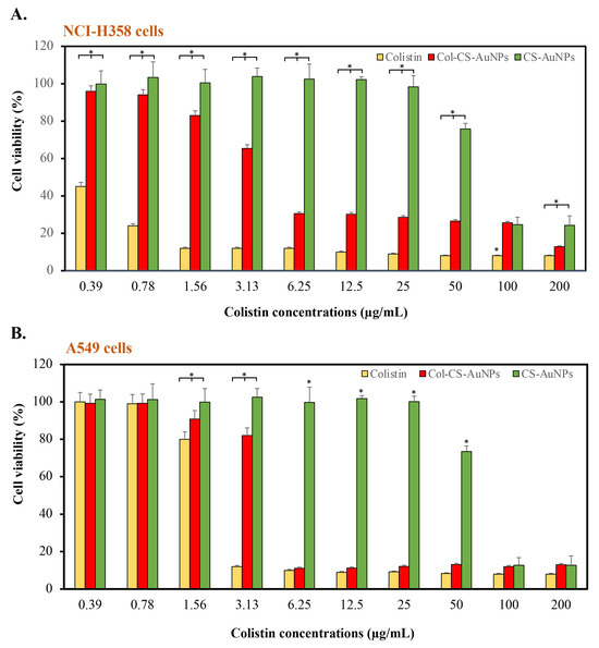 Percent viability of NCI-H358 cells (upper respiratory tract cell line) (A) and A549 cells (lower respiratory tract cell line) (B) to determine cytotoxic effect by MTT assay after incubation with colistin (orange bars), colistin conjugated with chitosan-capped gold nanoparticles metered-dose inhaler (Col-CS-AuNP MDI) formulation (red bars), and chitosan-capped gold nanoparticles (CS-AuNPs) used as blank (green bars). Data represent the mean ± standard deviation, n = 3. The asterisk (*) indicates significant differences (p-value < 0.05) between the groups.