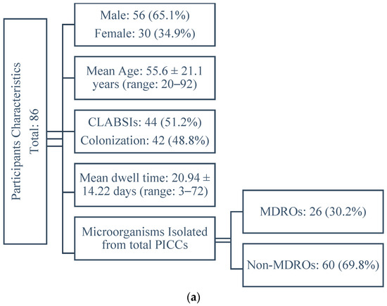 The definitions used in the study were as follows: (a) Peripherally inserted central catheters (PICCs) were categorized as catheters inserted into the basilic, cephalic, or brachial veins of the upper extremities, with tips terminating in the superior vena cava or right atrium; (b) Multidrug-resistant microorganisms (MDROs) were identified as microorganism species exhibiting antimicrobial resistance to at least one antimicrobial drug in three or more antimicrobial categories. This definition encompassed both Gram-positive and Gram-negative bacteria; (c) Catheter-associated bloodstream infection (CLABSI) was defined as a laboratory-confirmed bloodstream infection (a positive blood culture with no other apparent source of infection) occurring in the presence of a CVC or within 48 h of CVC removal; and (d) Catheter colonization was considered the presence by a semi-quantitative culture of ≥15 CFU of at least a single organism per catheter, according to Maki [42].