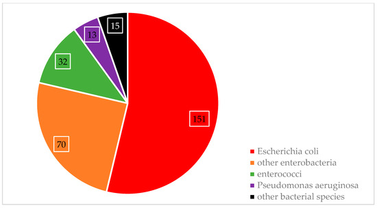 There were 458 individuals clinically diagnosed with a UTI (ICD-10 codes N39.0, N39.2, N39.3; number of patients with pyelonephritis: 139), and the vast majority (444 patients; 96.9%) of those were confirmed by applying the definitions as described above. A total of 281 pathogens were isolated from urine samples while 339 urine samples remained culture negative. Escherichia coli and other coliform bacteria were the main causes of UTIs, as shown in Figure 1. A more detailed description of the pathogen species in urine samples is provided in Table A3 (Appendix A).