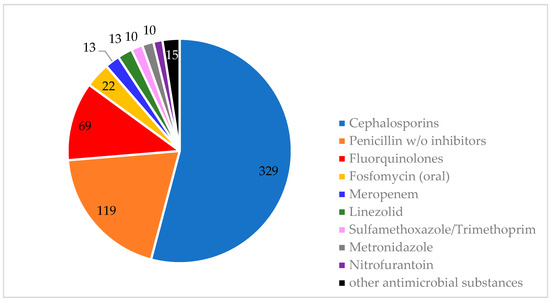 In 542 (95.4%) of the cases, an antibiotic was prescribed empirically, but only in 61.8% (362) of the cases were samples taken for microbiological culturing and subsequent susceptibility testing. During the study period, 29 different antibiotic agents were utilized (Table A5 and Table A6 (Appendix A)). As shown in Figure 3 for the management of UTIs, the three most frequently used agents were ceftriaxone (63%), amoxicillin/clavulanic acid (22%), and ciprofloxacin (8%). In the treatment of BSIs, the most used agents were ceftriaxone (44%), piperacillin/tazobactam (33%), and amoxicillin/clavulanic acid (23%) (Figure 4). The mean duration of initial antibiotic treatment was 4.51 days (intravenous therapy: 4.8 days; oral formulation: 4.2 days). In 63 (11.6%) of the cases, the treatment was escalated by switching to a broader spectrum antibiotic. However, in 115 (21.2%) of the cases, the treatment could be de-escalated to a narrower spectrum substance. There was adherence to the established guidelines for antimicrobial therapy in less than half (241 (41.1%)) of the cases.