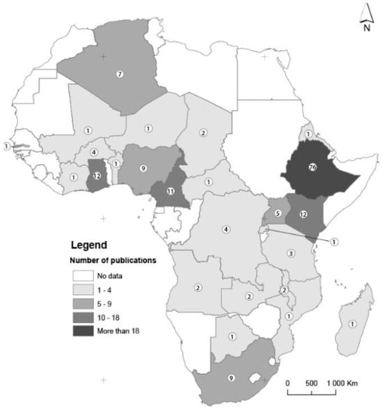 The majority of the final selected articles were published in 2019 (38/167, 22.6%), with most of them having a collection period for the reported isolates falling before 2016 (95/167, 56.5%). As shown in Figure 1 a high number of the reviewed articles were conducted in Ethiopia (76/167, 45.2%) with the rest of the countries represented in a low number of articles; for example, Mali, Niger, and the Central African Republic, etc., are represented in one article (0.6%) (Supplementary Materials, Table S2 and Figure 1 below).