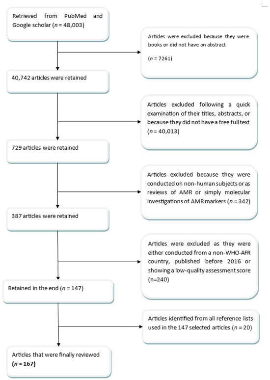 From the initially retrieved 48,003 articles, 7261 were excluded because they were either books or did not have an abstract; 40,013 articles were excluded because they did not fit with our review topic or lacked free full-text versions. A total of 342 articles were subsequently excluded because they were conducted on non-human subjects as reviews of AMR or simply as molecular investigations of AMR markers. At the next stage, 240 articles were excluded because they were either published before 2016, showed a low-quality assessment score, or were conducted in a country outside the WHO African Region. A total of 147 articles that were retained were also added to the other 20 that were identified from all their respective reference lists. This yielded a total of 167 articles that were analyzed in this review. A complete description of all the steps followed, as described in the reporting of systematic reviews used to select the final articles that were included in this review, is found in the flowchart presented in Figure 4 below [39].