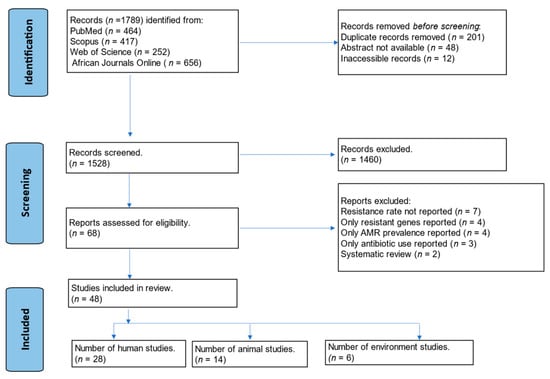The initial search of the online databases identified a total of 1789 publications. After removing duplicates and inaccessible records, the titles and abstracts of the remaining 1528 records were screened. From these records, 1460 articles were excluded because they did not meet the inclusion criteria. Subsequently, 68 full-text articles were assessed for eligibility, of which 48 [16,17,18,19,20,21,22,23,24,25,26,27,28,29,30,31,32,33,34,35,36,37,38,39,40,41,42,43,44,45,46,47,48,49,50,51,52,53,54,55,56,57,58,59,60,61,62,63] met the inclusion criteria (Figure 1). These 48 articles included 28 studies on humans, 14 studies on animals, and six studies on the environment. The “human studies” included various populations, including healthy volunteers, patients, and food handlers. Studies involving animals included livestock such as fish, poultry, pigs, and cattle. The “environmental studies” included various samples: water and hospital surfaces (such as door handles and doctors’ mobile phones).
