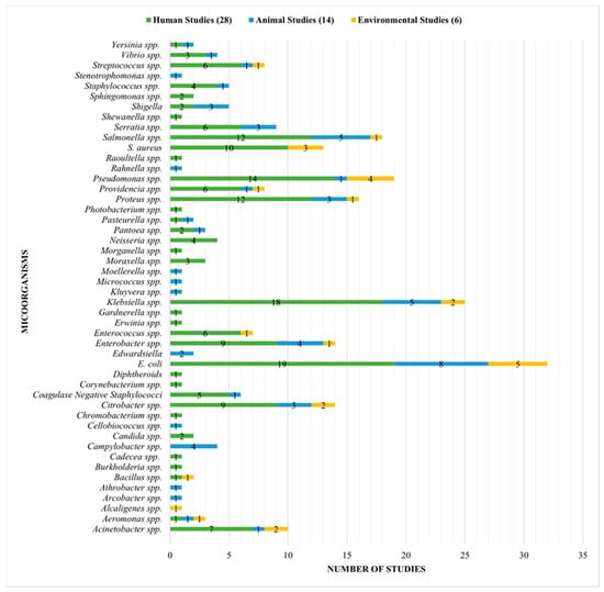 Forty-eight different bacterial agents were isolated across the “human”, “animal” and “environmental” sectors, with approximately one-third belonging to the Enterobacteriaceae family (Figure 2). E. coli was the most commonly reported organism for each of the three sectors: 19 “human studies”, eight “animal studies”, and five “environmental studies”. Klebsiella spp. was the next most commonly reported organism for each of the three sectors: 18 “human studies”, five “animal studies” and two “environmental studies”.