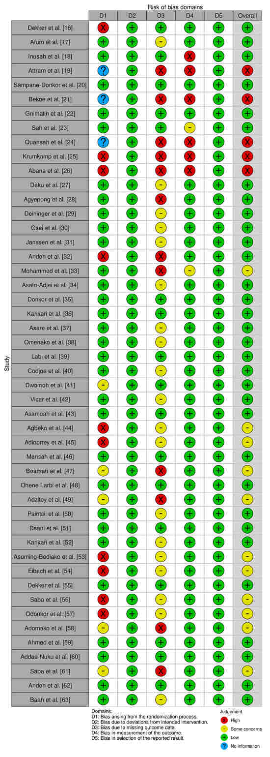 Assessment of bias of the included studies using the Cochrane risk-of-bias tool (ROB2) [16,17,18,19,20,21,22,23,24,25,26,27,28,29,30,31,32,33,34,35,36,37,38,39,40,41,42,43,44,45,46,47,48,49,50,51,52,53,54,55,56,57,58,59,60,61,62,63].