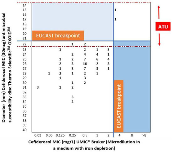 Comparison of microdilution in a medium with iron depletion: UMIC® Bruker with Thermo Scientific™ Oxoid™ cefiderocol antimicrobial susceptibility discs. (ATU: Area of technical uncertainty).