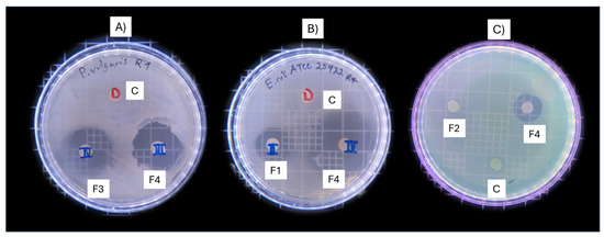 Preliminary antimicrobial activity of fractionated oregano. (A) Effect of F3 and F4 on P. vulgaris. (B) Effect of F1 and F4 on E. coli. (C) Effect of F2 and F4 on P. aeruginosa. Fractions 1–4 (F1, F2, F3, F4). Control (C).