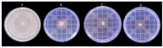Anti-motility effect of fractionated oregano against P. vulgaris. (A) Control: without fractionated oregano, (B) Fraction 4, (C) Residual oil, (D) P-OEO.