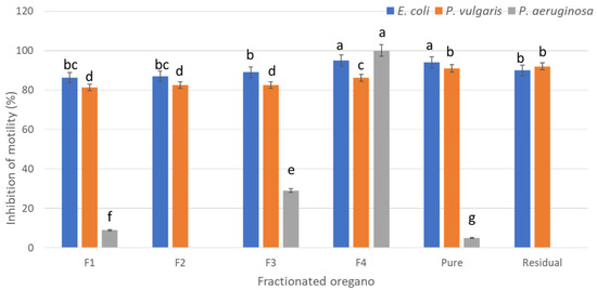 Inhibition of bacterial motility after incubation with different fractions of oregano. The concentration added was the 50% of the MBC. Different letters are significant differences. Error bars represent standard deviation.