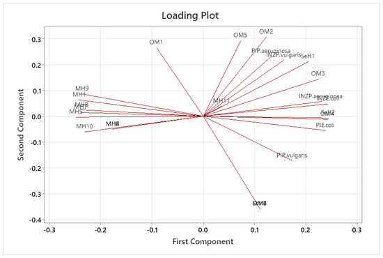 Loading plot that presents the distributions of the variables in the first and second principal components.