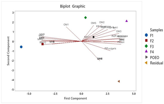 The principal component analysis is shown in Figure 5, in which the loading plot allowed us to establish the correlation of the organic compounds detected in each fraction (F1-4, R, and P-OEO) with the percentages of motility inhibition and the growth inhibition zones in E. coli, P. vulgaris, and P. aeruginosa; the formation of two components that can be observed explains 88.1% of the data variability. Groups of compounds can be observed to correlate with each other; in a group, the compounds labeled OM2, OM3, OM4, and OM5 are correlated—that is, the oxygenated monoterpenes. In the same way, another group of compounds with the labels MH1, MH5, MH9, MH10, MH8, and MH3 corresponds to monoterpene hydrocarbons. It is observed that Eucalyptol (OM1) is placed somewhat distantly from the group of oxygenated monoterpenes, just like the monoterpene hydrocarbon α-Terpinene (MH11), which has a tendency to group with the oxygenated monoterpenes.