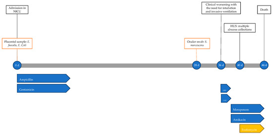 The newborn’s condition remained gravely stable until 45 days of life, when there was further clinical decline, with worsening metabolic acidosis; he was unresponsive to resuscitation attempts and the neonate died the following day at 46 days of life. The timeline of antimicrobial therapy, microbiological isolations and instrumental data is shown in Figure 1.