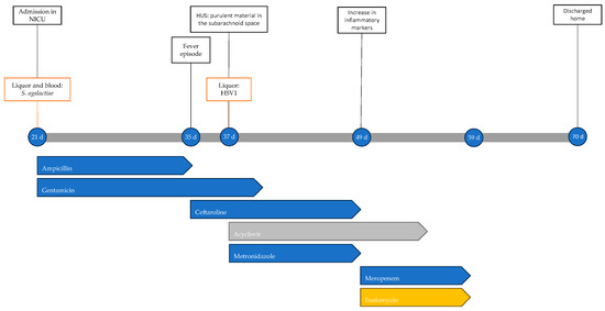 The neonate was discharged home at 28 days of life in good general condition and without sequelae; the resolution of epidural collections was also confirmed by ultrasound. Figure 5 shows the infectious events and antibiotic therapy performed during hospitalisation.