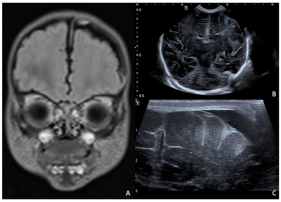 (A), Brain MRI in FLAIR sequence with evidence of left parietal subdural collection and multiple diffuse supra- and infratentorial subcentimetric collections. (B,C) HUS: left parietal subdural collection, with maximum thickness of 7 mm.