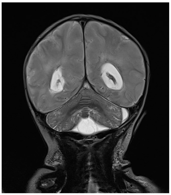 At 7 days of life, an HUS and a brain MRI were performed, showing a cerebral abscess lesion in the right caudate nucleus (Figure 8). Biochemical parameters in the CSF were normal. Blood and CSF cultures as well as PCR for neurotropic viruses and bacteria were negative. Empirical antibiotic therapy was modified by discontinuing ampicillin/sulbactam and starting broad-spectrum therapy with ampicillin, cefotaxime, and metronidazole.
