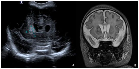 HUS (A) and brain MRI in T2 sequence (B): abscess of approximately 1 cm in diameter (delimited by the letters A and B in (A)) at level of right caudate nucleus in context compatible with hypoxic–ischemic encephalopathy. MRI in T2 sequence showed evidence of rim and hyperintense core.
