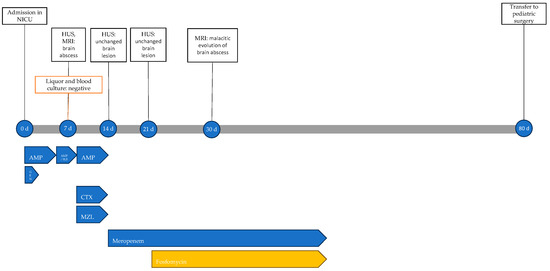 Timeline of infectious events and antibiotic therapy of Case 6. HUS: head ultrasound; MRI: resonance magnetic imaging; AMP: ampicillin; AMP/SLB: ampicillin/sulbactam; GEN: gentamicin; CTX: cefotaxime; MZL: metronidazole.