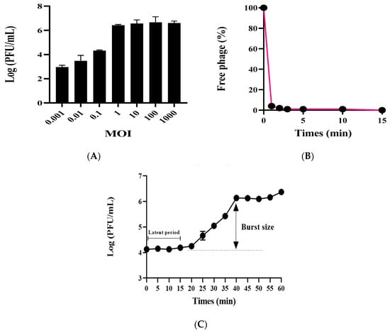 The phage adsorption assay was performed as follows. A. baumannii ATCC17978 was cultured in 20 mL of BHI medium until it reached the logarithmic phase (concentration: 1 × 108 PFU/mL) at OD600. To this culture, 2 mL of phage solution (concentration: 1 × 106 PFU/mL), filtered using a 0.22 μm syringe filter, was added. The final MOI was 0.001, and the mixture was then incubated at 37 °C. Samples of 1 mL were collected at specific intervals (0, 1, 2, 3, 5, 10, and 15 min), centrifuged at 13,500× g for 3 min, and filtered through a 0.22 μm filter. Plaque assays were performed with the filtrates to determine the plaque-forming units (PFU), which were calculated by counting 30–300 plaques on the plate after dilution in an SM buffer.