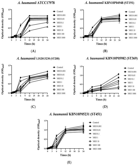 Growth curves of Acinetobacter baumannii strains in response to phage vB_AbaSi_W9 at various MOIs. (A) A. baumannii ATCC 17978, (B) A. baumannii KBN10P04948 (ST 191), (C) A. baumannii LIS2013230 (ST 208), (D) A. baumannii KBN10P05982 (ST 369), and (E) A. baumannii KBN10P05231(ST451). MOI was confirmed at a ratio of 0.001 to 1000 for each strain. Error bars represent the standard error of the mean (SEM).