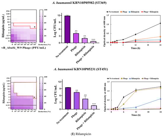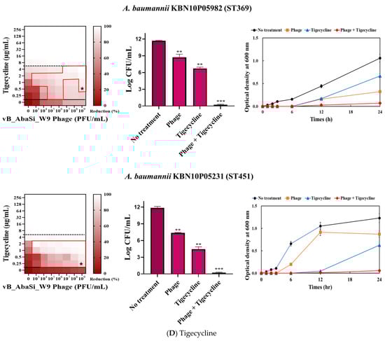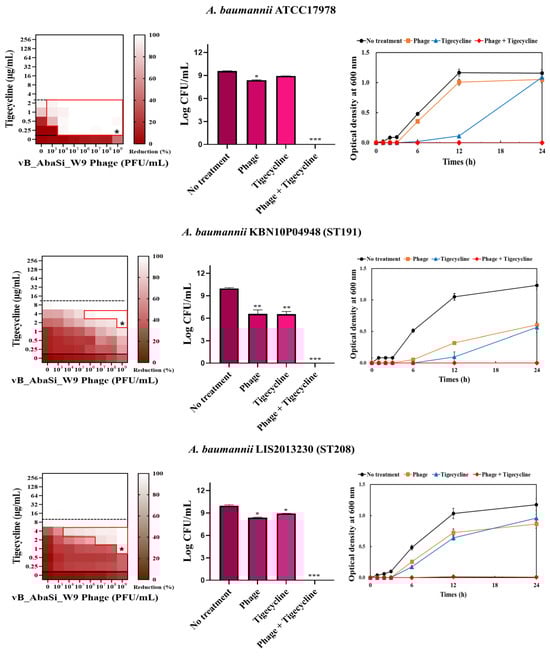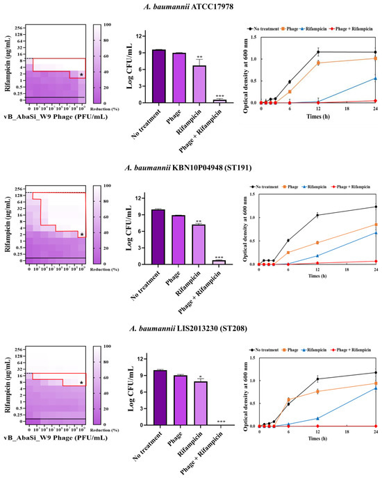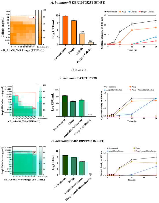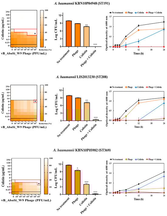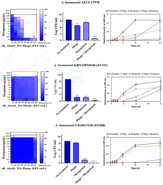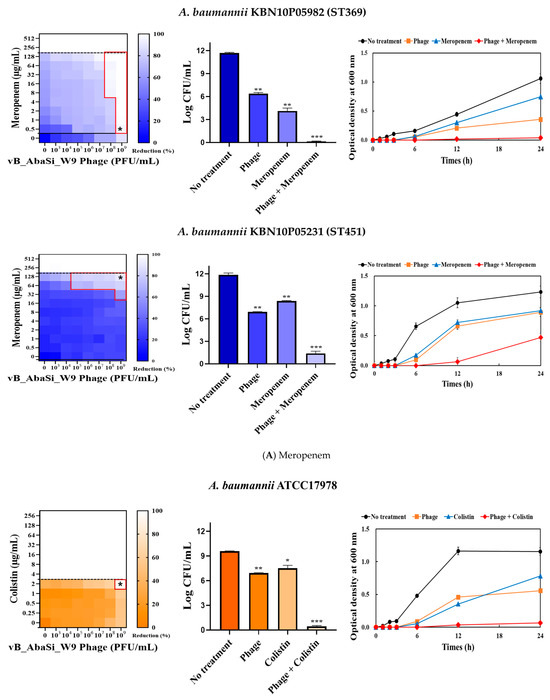 Phage vB_AbaSi_W9 was applied to BAP plates containing A. baumannii strains and incubated at 37 °C for 24 h. The strains grown on BAP were then transferred to 10 mL of BHI broth and cultured at 37 °C, shaking at 150 rpm, until the OD600 reached 0.5. Subsequently, 200 μL of this culture was added to 5 mL of MHI broth and incubated at 37 °C until reaching a final McFarland standard of 0.5. Following stationary culturing, the culture was diluted 200-fold and a diluted antibiotic solution (20 μL) was added and serially diluted 2-fold. Subsequently, 100 μL of the bacterial culture was added, followed by the phage solution at concentrations ranging from 103 to 109 PFU/mL (MOI 0.001 to 1000). The optical density of each mixture was measured at OD600 up to 24 h using a VersaMax microplate reader (Molecular Devices, LLC, San Jose, CA, USA). To calculate the percentage reduction, absorbance readings were adjusted by subtracting the values from negative control wells (untreated). These measurements were averaged after three repetitions to generate synograms.