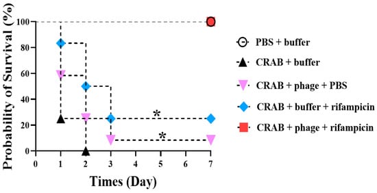 Evaluation of the combined therapeutic efficacy of phage vB_AbaSi_W9 and rifampicin against systemic infection by Acinetobacter baumannii KBN10P04948 (ST191) in mice. The bacterial concentration was 109 CFU, the phage was administered at an MOI of 1, the antibiotic concentration was 100 μg/mL, and saline magnesium buffer was used. Statistical significance was determined using Kaplan–Meier survival analysis with the log-rank test, * p < 0.05 compared to control groups.