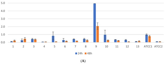4.2. Evaluation of Ability of Bacteria to Form Biofilms