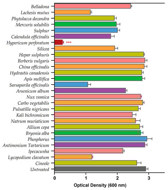 Primary screening of 26 homeopathic medicines against drug-resistant P. aeruginosa. Hypericum perforatum displayed the highest anti-biofilm activity, represented in a maroon color bar. Error bars show a standard deviation (SD) while statistical significance is considered at the level of p < 0.05 (indicated as red stars above bar). The experiment was performed three times independently in triplicate.