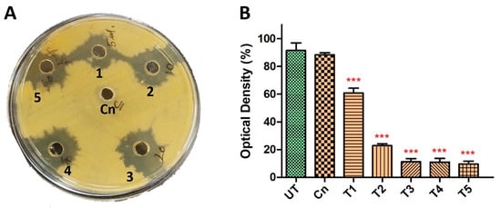 Synergistic antibacterial activity of HyPer and cineole. (A) Well diffusion assay displaying the synergistic action of HyPer and cineole. Well numbers 1, 2, 3, 4, and 5 indicate 5 μL, 10 μL, 20 μL, 40 μL, and 60 μL of HyPer (30 CH), respectively, in combination with 125 μg/mL of Cn. Cn alone was used as a control. (B) MIC determination of HyPer in combination with 125 μg/mL of cineole. T1, T2, T3, T4, and T5 indicate 5 μL, 10 μL, 20 μL, 40 μL, and 60 μL of HyPer (30 CH), respectively, in combination with 125 μg/mL of Cn. P. aeruginosa treated with Cn alone and 30% ethanol in PBS (UT) were used as controls. Error bars show a standard deviation (SD) while statistical significance is considered at the level of p < 0.05 (indicated as red stars above bars). All experiments were performed three times independently in triplicate.