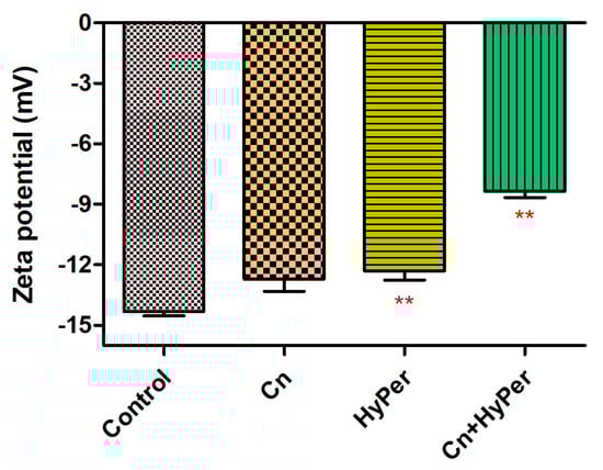We confirmed the synergistic killing action of HyPer and cineole against both planktonic cells and biofilms of a hospital-acquired drug-resistant strain of P. aeruginosa. Further, to determine the molecular mechanism of killing, we performed the assay and measured the zeta potential of untreated bacterial cells in comparison to the treated bacterial cell with cineole, HyPer, and a combination of both. Due to the presence of LPS, Gram-negative bacterial cell membranes possess high negative charges that should be observed as increased values of zeta potential if the outer membrane is compromised or disrupted [14]. Our results demonstrated about a 40% increase in zeta membrane potential values upon treatment with HyPer in combination with cineole while only a slight increase was observed with treatment of HyPer and cineole alone (Figure 3). The results suggested the synergistic action of HyPer with cineole via the disruption of the zeta membrane potential of P. aeruginosa cells.