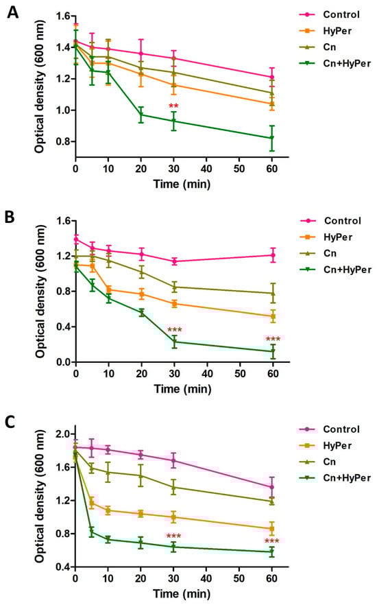 As the zeta potential assay revealed a significant increase upon treatment, we performed an outer membrane potential assay to confirm the outer membrane permeability and membrane-specific synergistic killing mechanism of HyPer and cineole. Normally, the outer membrane of Gram-negative bacteria is negatively charged and repels the other negatively charged molecules such as SDS. The compromised outer membrane of bacteria should result in a higher influx of SDS in terms of decreased absorbance at 600 nm. We performed an outer membrane permeability assay using low concentrations of SDS as a membrane permeabilization probe for the treatment time points of 1 h, 2 h, and 3 h (Figure 4). Our results revealed a time-dependent disruption of outer membrane permeability upon treatment with HyPer, cineole, and a combination of both. It is very clear that the increasing treatment time results in enhanced membrane permeabilization, which is also in agreement with the earlier experiments. Also, at all three different time points, treatment using the combination of HyPer and cineole showed the highest membrane permeabilization, which confirmed the synergistic membrane-specific killing mechanism of HyPer and cineole (Figure 4A–C).