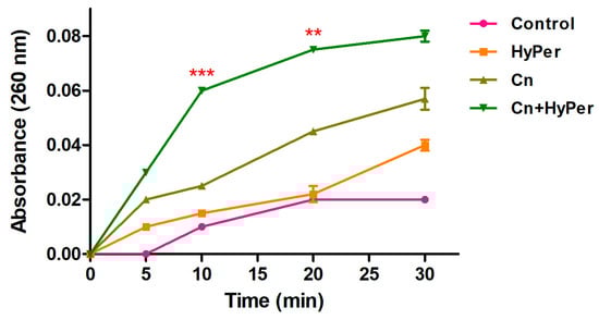 We performed a DNA leakage assay to further assure the membrane permeabilization upon treatment with HyPer in combination with cineole. Our DNA leakage assay was in agreement with the zeta potential and the outer membrane permeabilization assay results (Figure 5). The HyPer and cineole combined treatment showed the highest absorbance at 260 nm, which again confirmed the synergistic killing mechanism of HyPer and cineole.