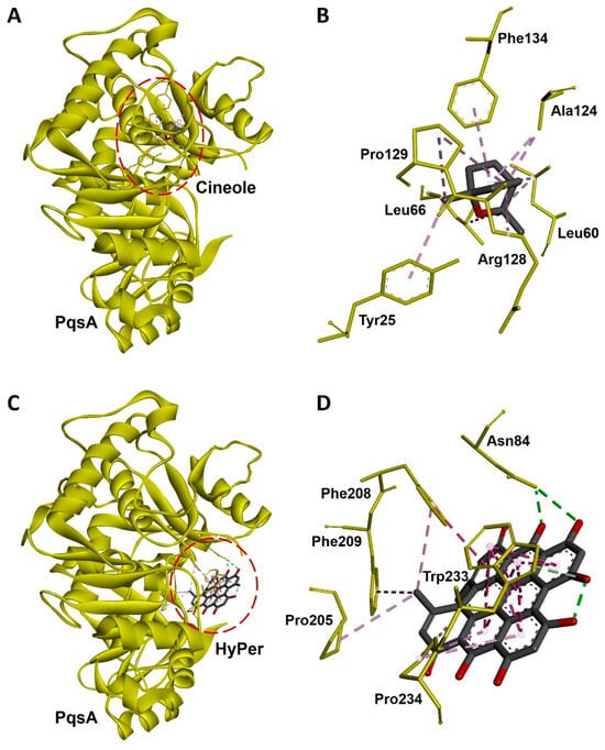 Molecular docking and interaction of cineole and hypericin with PqsA, a biofilm-forming protein of P. aeruginosa. (A) Docked complex of cineole and PqsA. The dotted red line circle highlights the position of cineole in the complex. (B) Three-dimensional representation of interacting amino acid residues of PqsA with cineole upon docking. (C) Docked complex of hypericin and PqsA. The dotted red line circle highlights the position of hypericin in the complex. (D) Three-dimensional representation of interacting amino acid residues of PqsA with hypercin upon docking. PqsA is shown as a yellow ribbon while cineole, hypercin, and interactive amino acid residues are shown as sticks. Interacting bonds are represented as dotted green, purple, and violet lines.