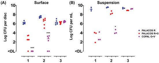 In vitro activity of the ALBC discs with (A) attachment to the disc surface and (B) growth in the suspension after 1–3 days of incubation, with a daily challenge of a fresh S. aureus EDCC 5055 inoculum suspension. Results are expressed as the numbers of viable bacteria retrieved from the disc surface (n = 6) and medium (n = 3). The horizontal lines represent the median values and are significantly different from the PALACOS R control groups as calculated by the Kruskal–Wallis rank sum test for the log CFU values (* = p < 0.05, *** = p < 0.001). The lower limit of detection (DL) is 25 and 5 CFU for the discs and medium, respectively.