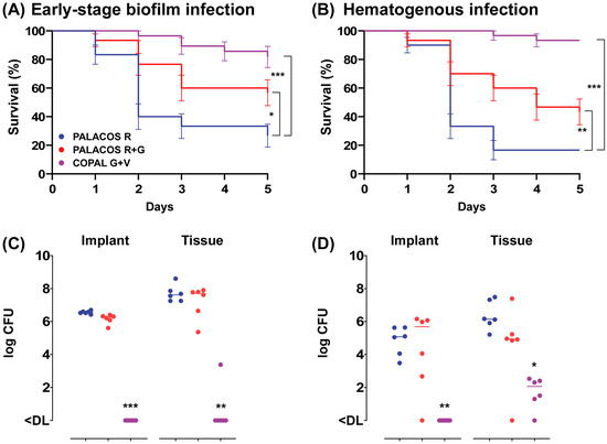 Prevention of (A) early-stage biofilm implant infection and (B) hematogenous implant infection by implantation of ALBC implants in G. mellonella larvae. For the early-stage biofilm infection, the ALBC implants were pre-incubated for 60 min in S. aureus solution (5 × 106 CFU/mL) prior to implantation in the larvae. The mean number of bacteria before implantation was log 4.6 CFU (PALACOS R), log 3.4 CFU (PALACOS R+G) and log 2.4 CFU (COPAL G+V) per implant (n = 3 per group). In case of the hematogenous implant infection, the ALBC implants were first implanted in the larvae, followed by an injection with 10 µL of S. aureus inoculum (5 × 104 CFU/larva) after 60 min. Percent survival (±SEM) over time (in days) is displayed after implantation of implants loaded with gentamicin alone (PALACOS R+G) or the combination of gentamicin and vancomycin (COPAL G+V), and non-loaded implants served as controls (PALACOS R). The data from three independent experiments were analyzed (n = 10 larvae per experiment) and statistical analysis was performed using a log rank test. The number of S. aureus on the ALBC implant (“Implant”) and in the tissue of the larvae (“Tissue”) after 24 h incubation in the (C) early-stage biofilm and (D) hematogenous implant infection model was determined. The horizontal lines represent the median values. Statistical analysis was performed using Kruskal–Wallis rank sum test (n = 6 per group). * = p < 0.05, ** = p < 0.01, *** = p < 0.001. The lower limit of detection (DL) is 5 and 3 CFU for the tissue and implants, respectively.