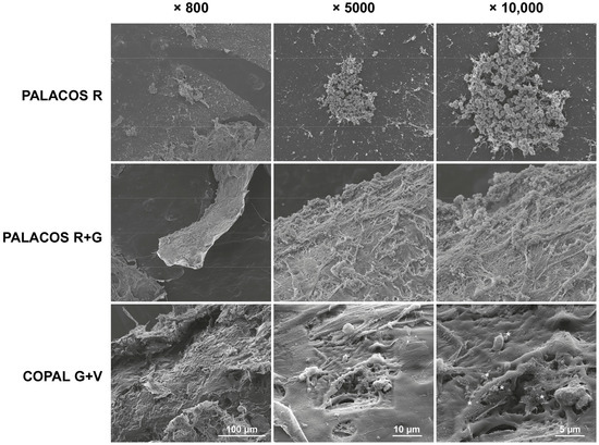 These findings are confirmed by SEM analysis of explanted bone cement implants from the hematogenous infection model. A high number of bacteria colonized the surface of non-loaded ALBC implants (PALACOS R), with starting biofilm formation being observed, and less bacteria on the PALACOS R+G implants (Figure 4). In line with the quantitative culture results, only individual bacteria were seen on the surface of COPAL G+V.