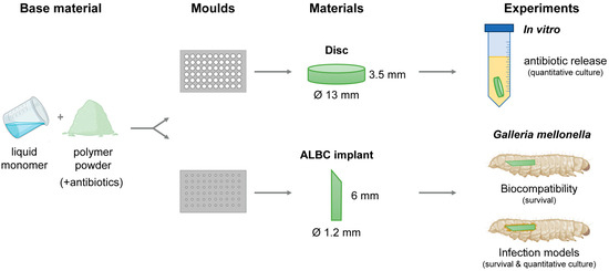 Development of experimental procedures. In short, the polymer powder was mixed with the monomer liquid and the resulting paste pressed into Teflon moulds to prepare uniform discs and cylindrical ALBC implants, for the in vitro and in vivo assays, respectively. The in vitro antimicrobial activity of the ALBC discs was determined. The in vivo biocompatibility was assessed in G. mellonella. Next, the in vivo effectivity was determined in the G. mellonella early-stage biofilm and hematogenous implant infection models.