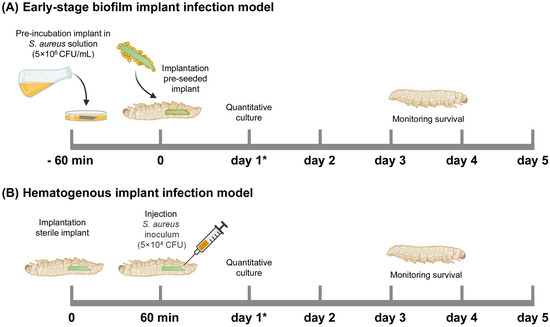 Schematic overview of the Galleria mellonella implant infection models used in this study. (A) Early-stage biofilm implant infection model: An ALBC implant was incubated in an S. aureus solution (5 × 106 CFU/mL) for 60 min before implantation in the larva. (B) Hematogenous implant infection model: a sterile ALBC implant was implanted in the larva, and 10 µL S. aureus inoculum (5 × 104 CFU/larva) was injected after 60 min. The survival of the larvae was monitored for 5 days. N = 30 larvae per experimental group. At 1 day after infection (see *), the number of CFU at the implant surface and in the tissue of the larvae was quantitatively determined (additional larvae, n = 6 per group).