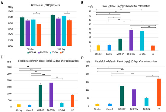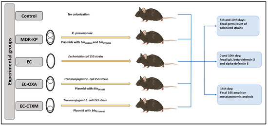 Stercz, B.; Domokos, J.; Dunai, Z.A.; Makra, N.; Juhasz, J.; Ostorhazi, E.; Kocsis, B.; Szabo, D. The Roles of a Multidrug-Resistant Klebsiella pneumoniae High-Risk Clone and Its Resistance Plasmids on the Gastrointestinal Colonization and Host-Defense Effectors in the Gut. Antibiotics 2024, 13, 698. https://doi.org/10.3390/antibiotics13080698