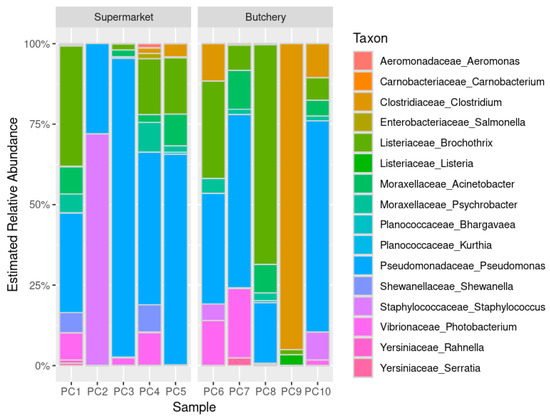 The distribution of the bacterial community structures in the raw meat samples reveals functional diversity among bacteria (Figure 1). The relative abundance was similar between raw meat samples from supermarkets and butcheries, but PC9 was different.