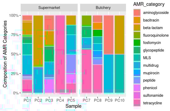 Composition of predicted AMR categories in 10 raw meat samples as predicated by PathoFact database. MLS = macrolides, lincosamides, and streptogramins; AMR category = default assignment by the PathoFact pipeline; PC6 = no AMR was detected.