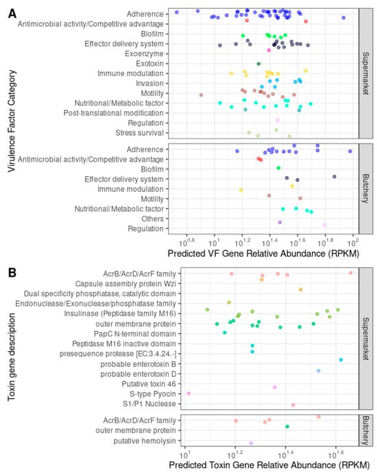 Relative abundance of the individual predicted virulence factors (VFs) and toxin genes in 10 raw meat samples (normalized as reads per kilobase of reference sequence per million mapped sample reads (RPKMs)), grouped by the VF category according to VFDB (A), and by toxin gene description according to the PathoFact database (B). Each circle indicates the relative abundance of a VF/toxin gene in a single sample. Genes within the same VF category or toxin gene description are represented with the same colour.