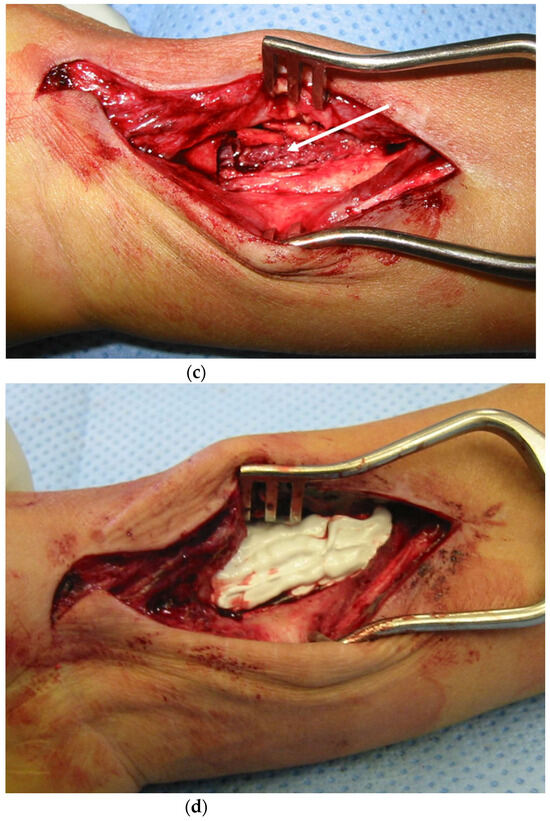 All patients were treated with a single-stage protocol incorporating deep tissue sampling, excision of dead and compromised tissue, management of the excised dead space, bone stabilization (if required) and soft tissue closure, as previously described [32] (Figure 2a–e).