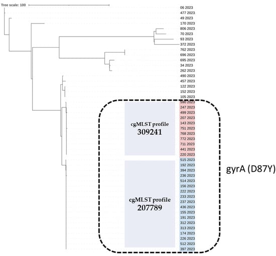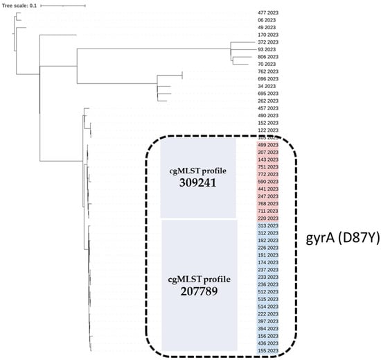 Although Single-Nucleotide Polymorphism (SNP) analysis provided a higher level of resolution than cgMLST, the two derived trees have the same topology and lead to the same results; the fluoroquinolone-resistant isolates that include the gyrA (D87Y) mutation and belong to closely related cgMLST profiles 207789 (n = 18) and 309241 (n = 11) are arranged in a similar way in the two trees (Figure 1 and Figure 2).