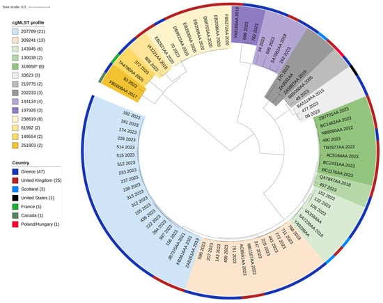 A Single-Nucleotide Polymorphism (SNP)-based phylogenetic tree of 79 Salmonella Enteritidis strains; 47 were isolated from human samples in 2023, Greece, and 32 were downloaded from Enterobase. The strain ID, cgMLST profile, originating country, and year of isolation are given for each strain. Both the cgMLST profile and originating country are highlighted with different colors, explained in the respective legends. SNP analysis was conducted using Snippy [33]; the maximum likelihood tree was constructed using RAxML [34] and visualized with iTOL [32]. * Of the 44 S. Enteritidis cgMLST profile 318658 genomes found in Enterobase (accessed on 16 July 2024), 7 representative isolates were included in the phylogenetic tree.