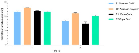 Agar Diffusion testing for early release (within 24 h). The results of the agar diffusion tests with methicillin-susceptible S. aureus (DSM 799) after 1 h and 24 h of elution are shown in Figure 1. The inhibition zones of all tested cements in the modified Kirby–Bauer assay were similar within the first hour, showing no significant difference regarding the early release of antibiotics. After transfer into fresh buffer and 24 h of incubation, all inhibition zones were reduced compared with the samples after 1 h, mainly for VancogenX® and SmartSet® GHV.