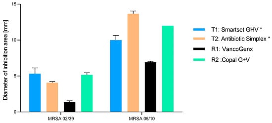 All tested vancomycin-containing cements showed zones of inhibitions against all clinically vancomycin-susceptible MRSA strains. The lowest efficacy was observed with VancogenX® (R1). When testing the 24 h eluates against MRSA, all cements showed comparable results in their release with the exception of Smartset® GHV (T1) and VancogenX® (R1). The diameters of the inhibition areas were significant smaller (p < 0.001) compared to the other cements, and also, the activity against MRSA was impaired. The lower content of vancomycin cannot only explain lower efficacy, as VancogenX® (R1) contains a higher amount of gentamicin combined with its synergistic effect for efficacy and release.