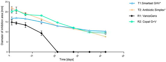 Agar diffusion testing for long term release. Zone of inhibition investigations for methicillin-susceptible S. aureus over a period of 42 days are shown in Figure 3. VancogenX® (R1) had the lowest zone of inhibition diameters over 42 days, and after day 21, no antimicrobial activity was detectable. Both cements of the test group and Copal® G+V (R2) showed similar zone of inhibition diameters over the whole test period.