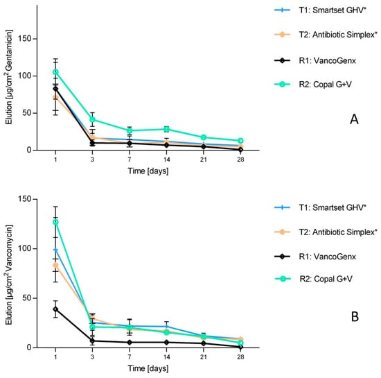 Long-term elution of gentamicin (A) and vancomycin (B) determined by HPLC. Values are given as mean with standard deviation. * means manually added Vancomycin.